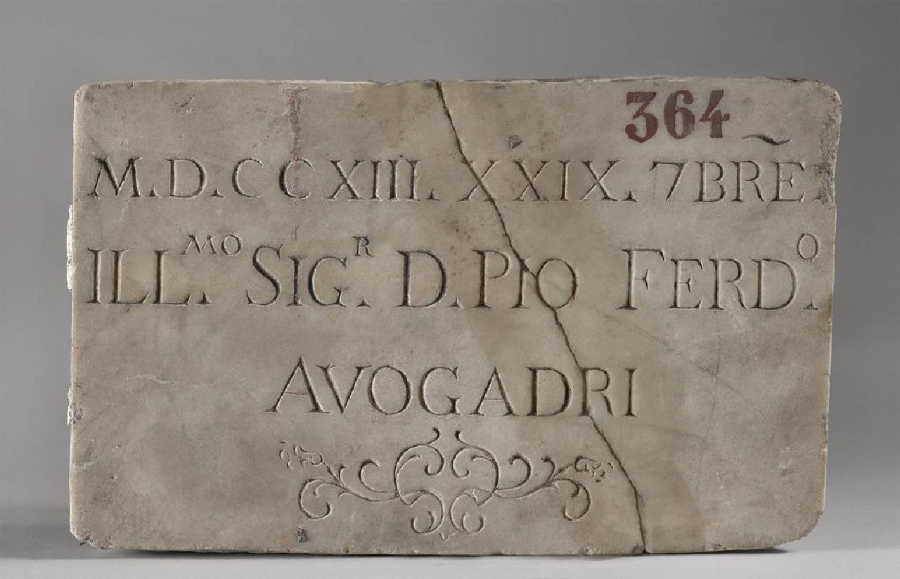 Lastra rettangolare con iscrizione commemorativa riferita a don Pio Ferdinando Avogadri. Composta da due frammenti contigui e solidali.