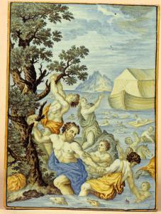 Mattonella a decorazione policroma su smalto bianco. In primo piano alcune figure cercano salvezza aggrappandosi a delle piante, altre figure e animali cercano di salvarsi dall'acqua sulla quale galleggia l'Arca di Noè chiusa, fondo è una montagna.