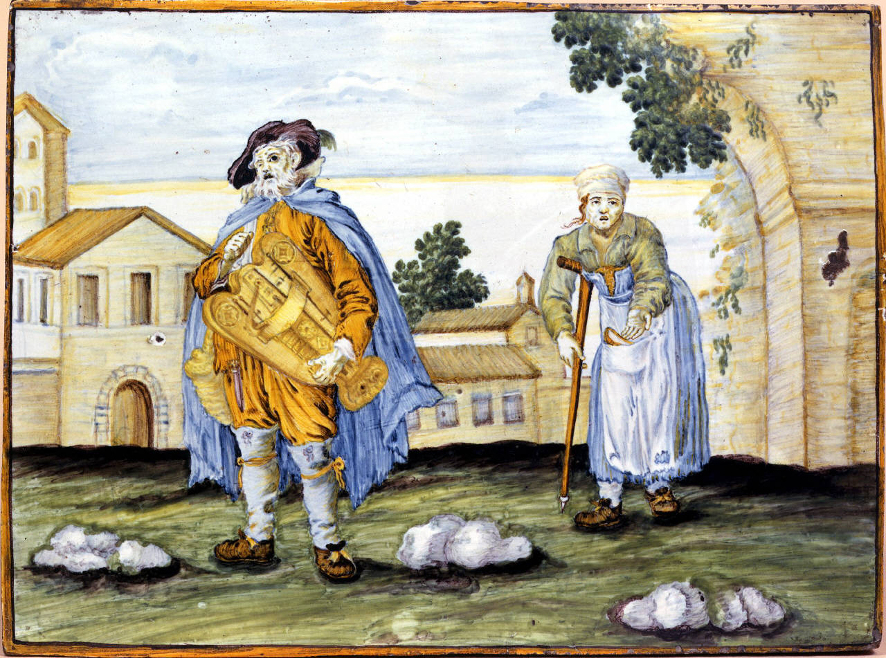 Mattonella a decorazione policroma su smalto bianco. E' impaginata come una scena di teatro: un fondale con case, chiesa e un arco diroccato con due soli personaggi: un uomo anziano cieco che regge la gironda e una donna mendicante con una stampella. \nSul rovescio compare il numero 2, in bruno.