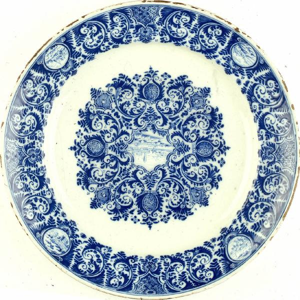 Grande piatto tondo dall'orlo liscio leggermente rilevato, stretta tesa e balza morbida. Al centro, in una riserva a cornice stellata, un paesaggio, intorno decorazione "a merletto", struttura radiale di elementi a "C" in un tessuto di piccole pennellate che simulano fogliame stilizzato, in cui sono inseriti quattro ovali reticolati alternati a piccoli scudetti. La tesa è decorata in modo simile, con gli stessi elementi a "C" alternati a quattro tondi che ospitano piccoli paesini e a morbide cornici con motivi a graticcio.