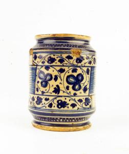 Albarello a corpo cilindrico, orlo estroflesso su breve collo, base poco espansa su piede a disco. Modellato a tornio, impasto rosato chiaro, smalto bianco-giallastro, dipinto in blu. Ornato da fasce di racemi con foglie e fiori entro filettature e al centro cartiglio con il nome del medicamento.