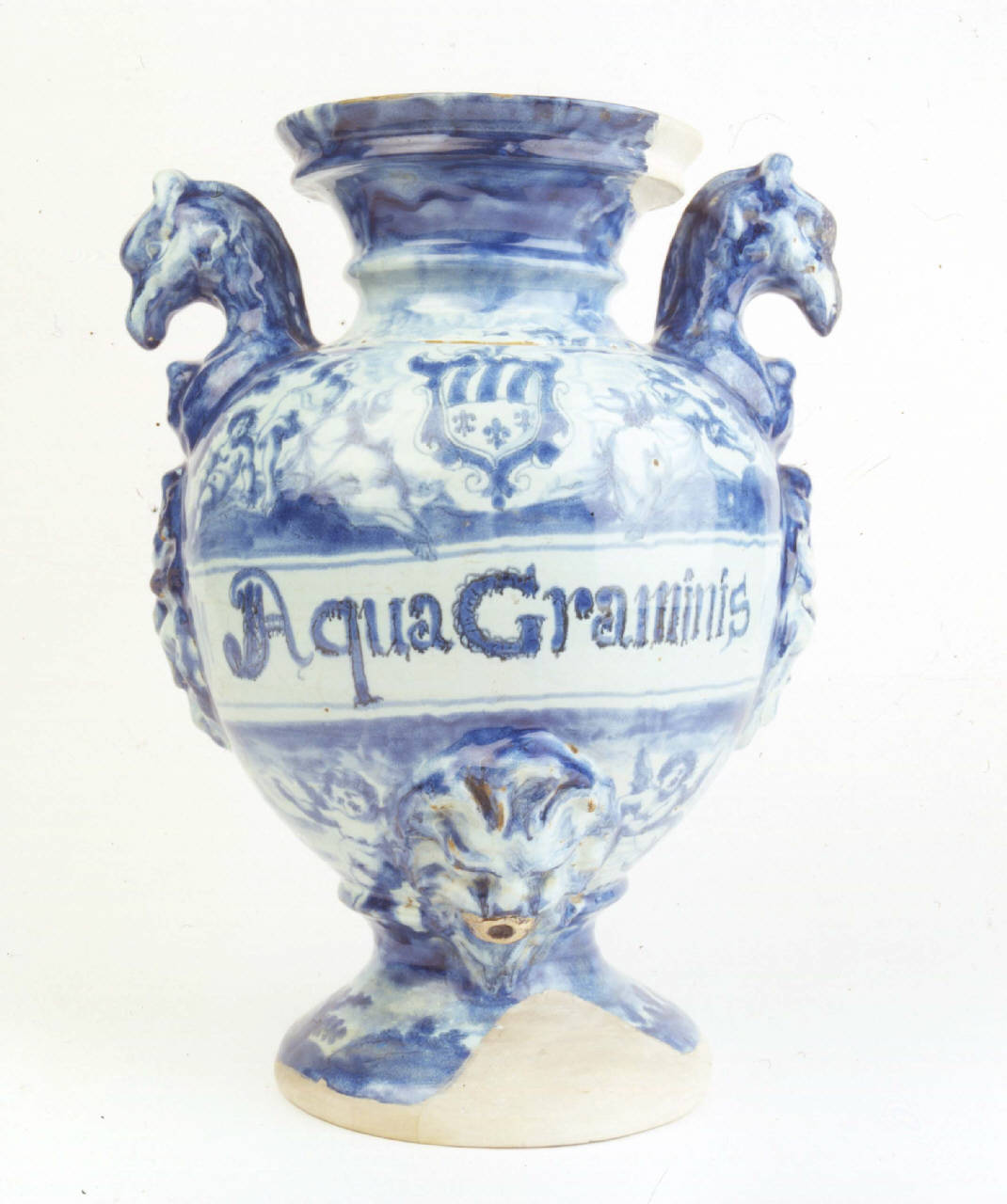 - NOTIZIE STORICO CRITICHE Sotto la base è posta la marca Lanterna che assicura la provenienza albisolese del pezzo. La presenza del blasone della famiglia Da Negro è forse riferibile alla loro funzione di committenti.\nIl vaso doveva contenere acqua medicamentosa di gramigna, impiegata contro i dolori al ventre, i calcoli e i parassiti intestinali.