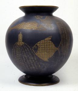 Largo piede svasato, corpo globulare dalla spalla espansa, corto collo cilindrico, bocca troncoconica svasata. Terraglia forte rivestita da smalto nerastro e ornata con pesci e animali marini in oro.
