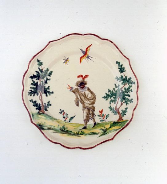 Piatto medio sagomato a quattro punte con orlo color bruno ornato con Pulcinella tra due alberi.