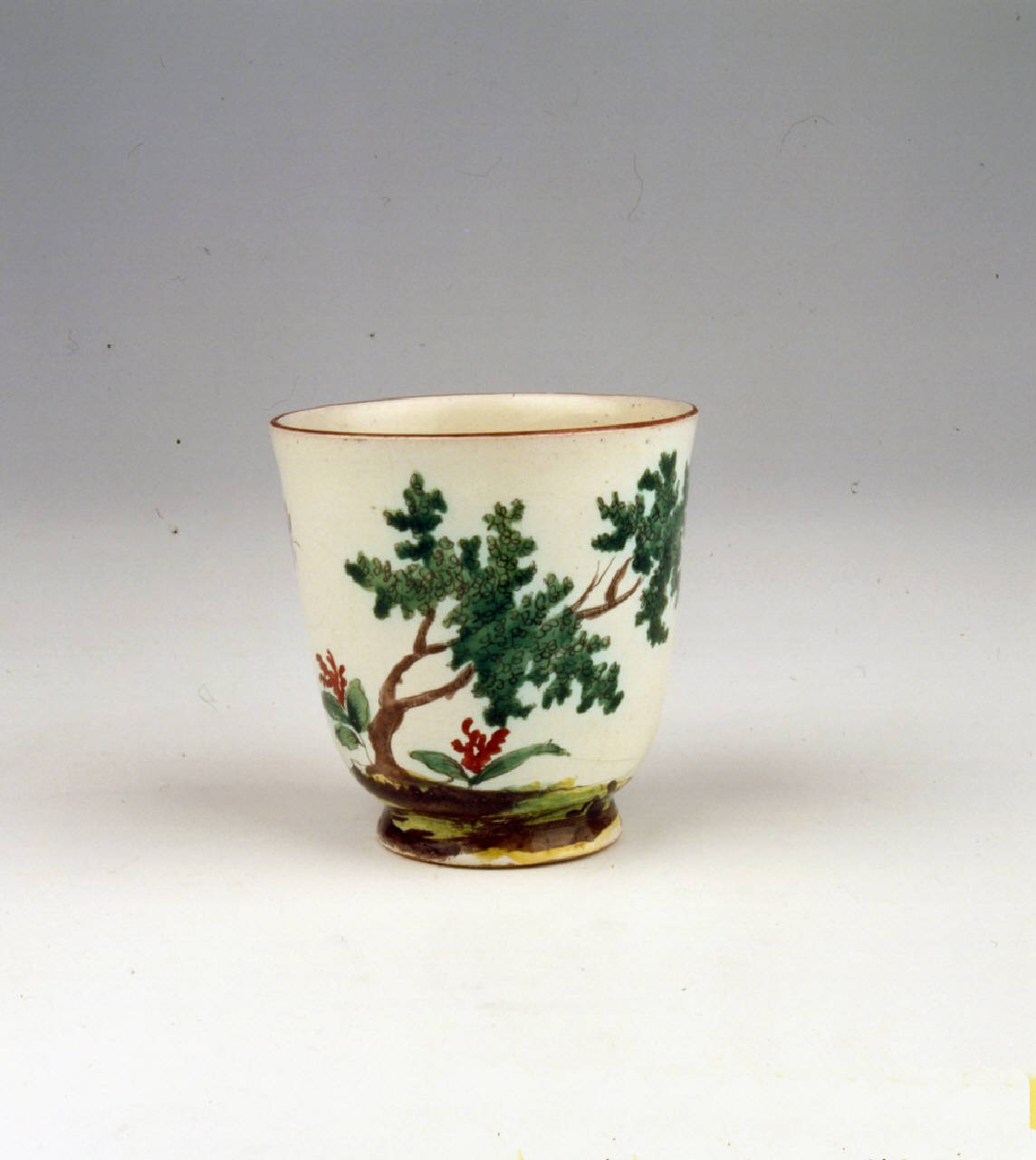 - NOTIZIE STORICO CRITICHE Tazzina parte di un assortimento formato da centoquarantotto pezzi, decorato "a paesini e figure a smalto" (cfr. Inventario manifattura Clerici 1788, A.S.M., Commercio 199), databile dopo il 1756, anno di adozione della tecnica a piccolo fuoco nella manifattura. A questa raccolta appartiene un piatto con la marca di Felice Clerici e la data 1767 (n. INV. 2338) (cfr. Ausenda, in Museo Arti, 2001).