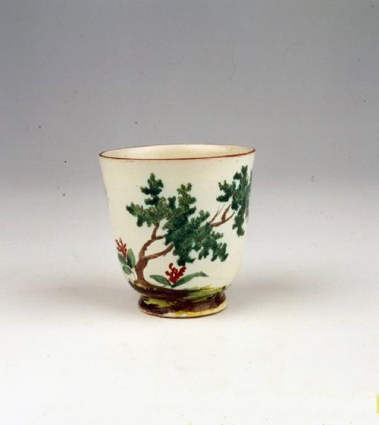 Tazzina a campana, piede circolare, orlo leggermente svasato. Decorazione con contadina e albero.