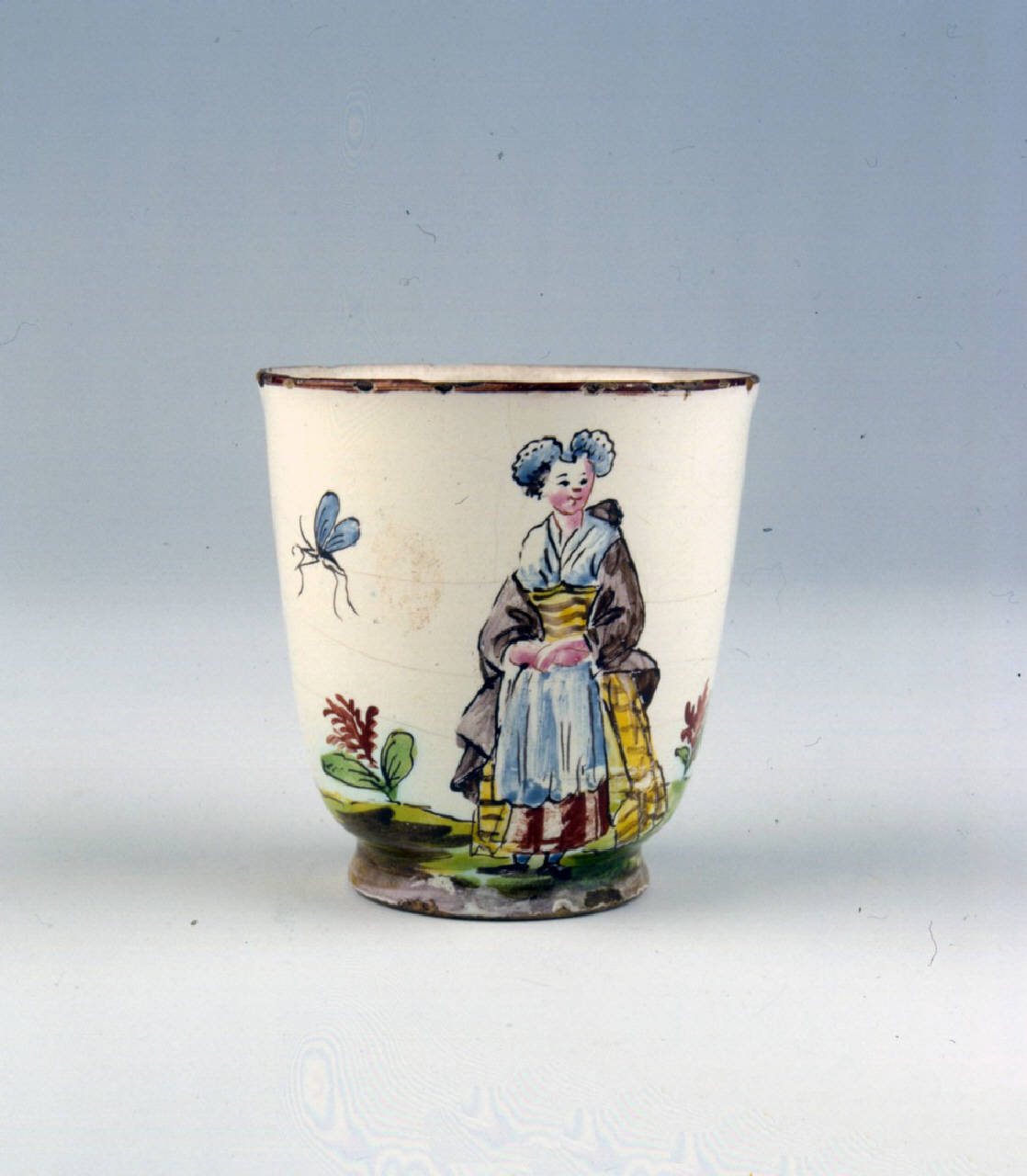 Tazzina a campana, piede circolare, orlo leggermente svasato. Decorazione con figura femminile, insetto e albero.