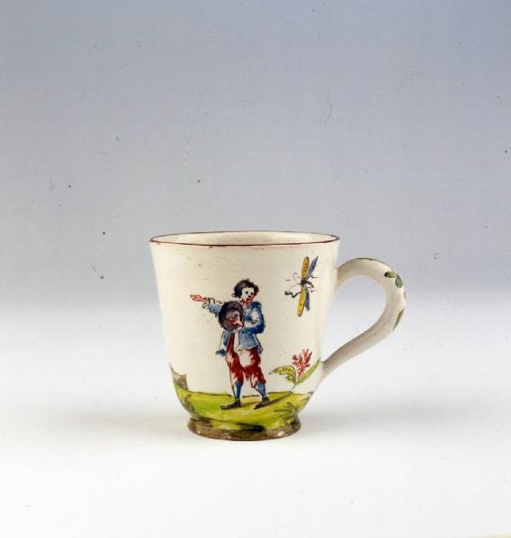 Tazzina a campana con manico, piede circolare, orlo leggermente svasato. Decorazione con figura maschile con cappello che indica e albero.