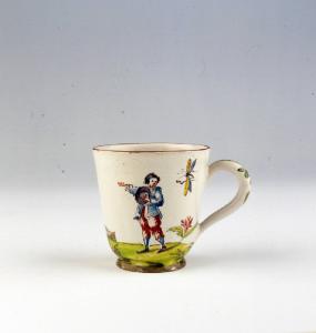 - NOTIZIE STORICO CRITICHE Tazzina parte di un assortimento formato da centoquarantotto pezzi, decorato "a paesini e figure a smalto" (cfr. Inventario manifattura Clerici 1788, A.S.M., Commercio 199), databile dopo il 1756, anno di adozione della tecnica a piccolo fuoco nella manifattura. A questa raccolta appartiene un piatto con la marca di Felice Clerici e la data 1767 (n. INV. 2338) (cfr. Ausenda, in Museo Arti, 2001).