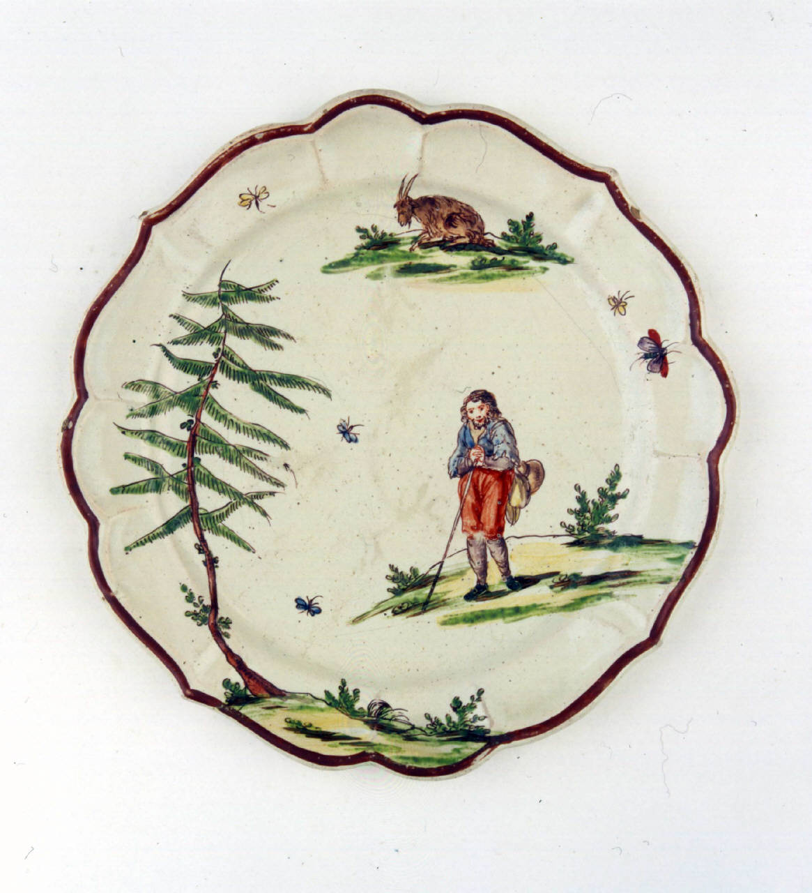 Piccolo piatto tondo (a quattro punte) ornato con motivo decorativo a zolle con viandante con bastone; capra accovacciata, insetti e pianta.