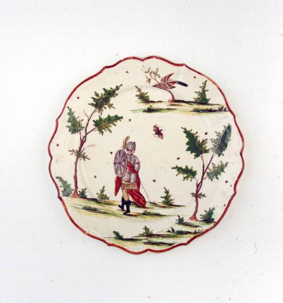 Piccolo piatto tondo (a otto punte) ornato con motivo decorativo a zolle con guerriero in costume romano, di schiena tra due alberi.