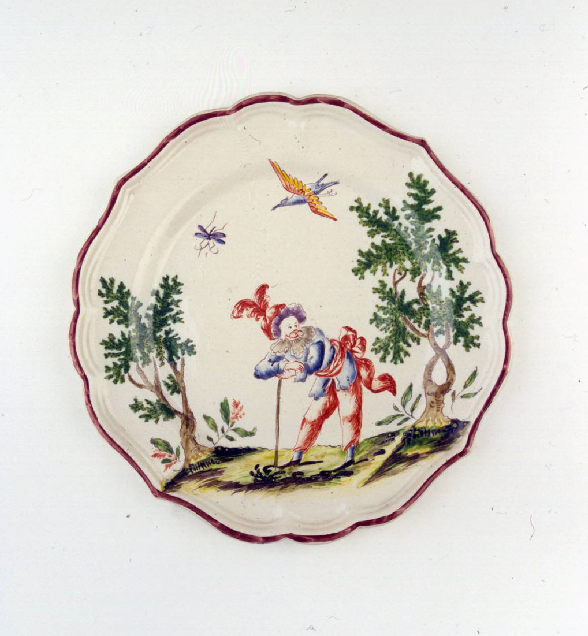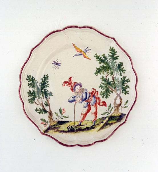 Piatto medio sagomato a quattro punte con orlo color bruno ornato con figura maschile orientale appoggiata al bastone tra due alberi.