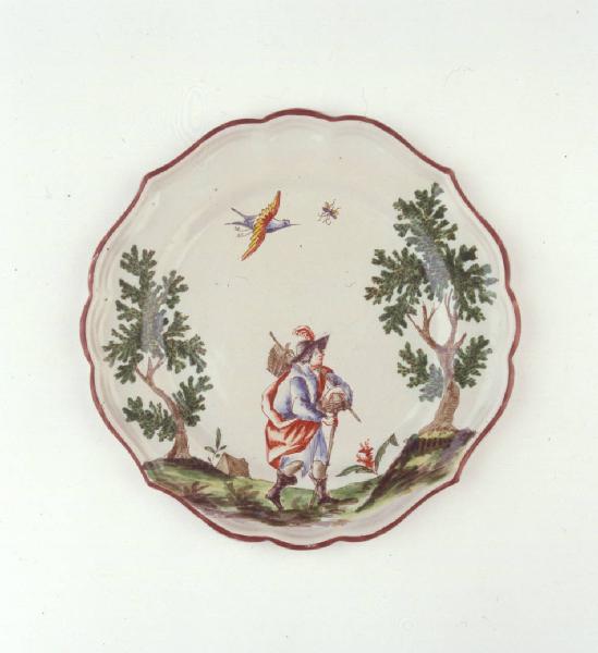 Piatto medio sagomato a quattro punte con orlo color bruno ornato con viandante tra due alberi.