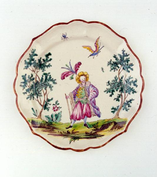 Piatto medio sagomato a quattro punte con orlo color bruno ornato con fiigura maschile orientale con bastone e cappello piumato tra due alberi.