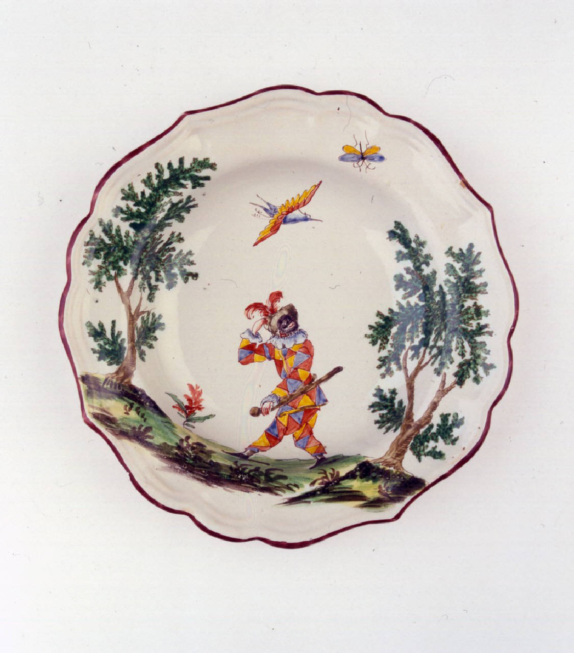 Piatto fondo sagomato a quattro punte con orlo color bruno ornato con arlecchino tra due alberi.