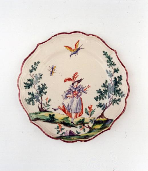 Piatto medio sagomato a quattro punte con orlo color bruno ornato con figura della Commedia dell'Arte che danza tra due alberi.