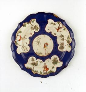 Piatto tondo sagomato a quattro punte. Fondo blu ornato con tondo bianco nel cavetto e tre cartelle sagomate nella tesa ornate con figure maschili, uccelli, insetti, alberi.
