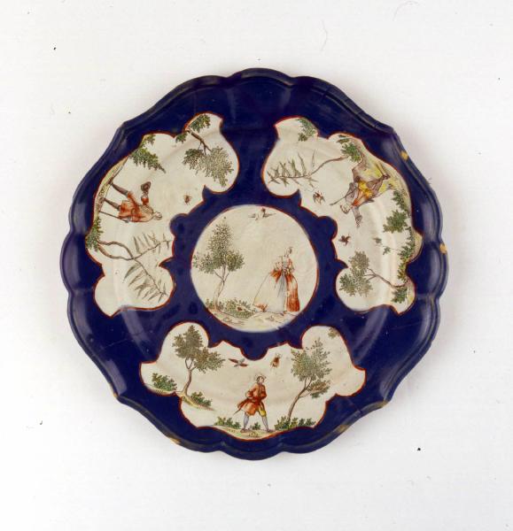 Piatto tondo sagomato a quattro punte. Fondo blu ornato con tondo bianco nel cavetto e tre cartelle sagomate nella tesa ornate con figure maschili, figura femminile, uccelli, insetti, alberi.