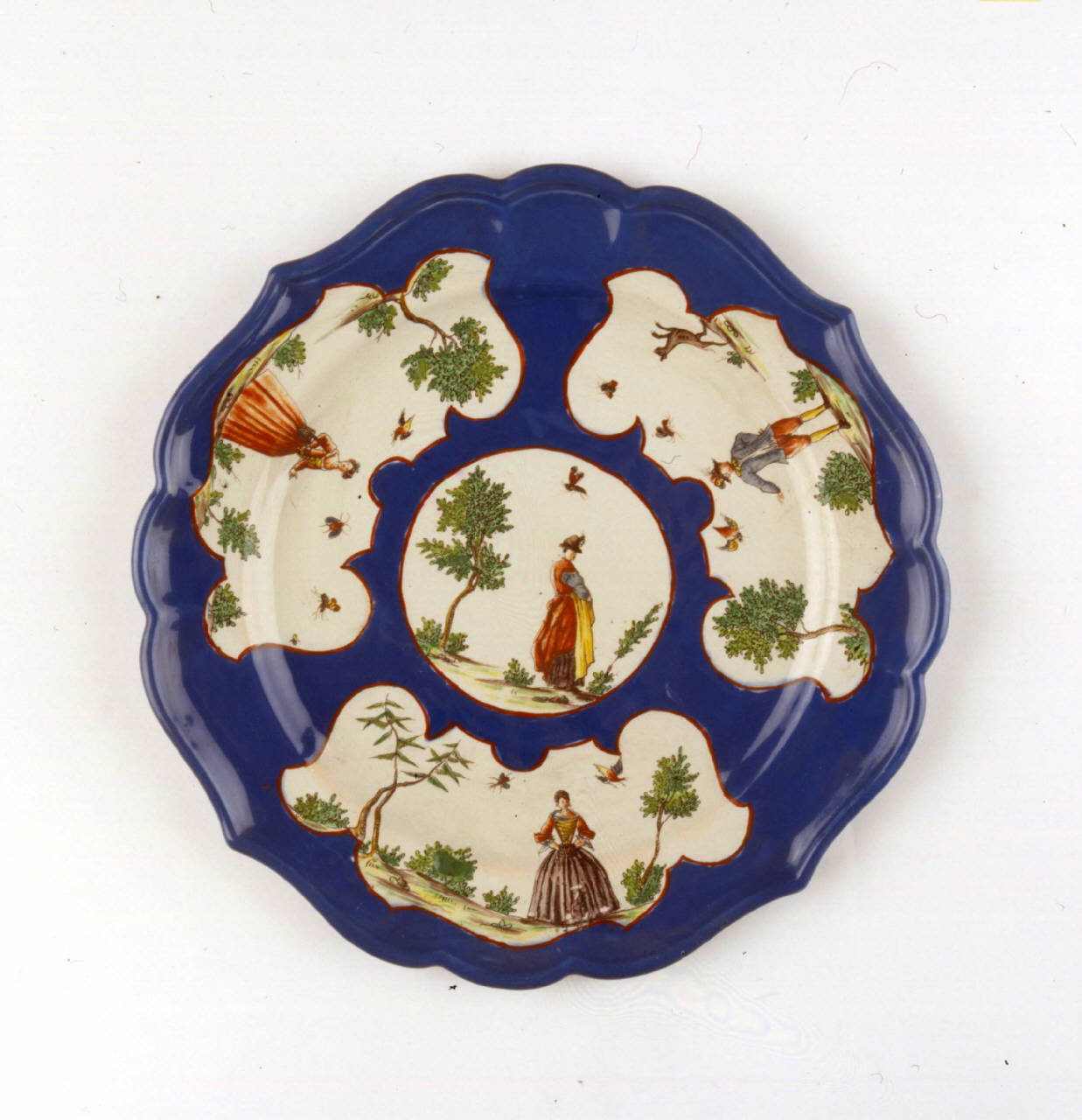 Piatto tondo sagomato a quattro punte. Fondo blu ornato con tondo bianco nel cavetto e tre cartelle sagomate nella tesa ornate con figure maschili, figure femminili, cane, uccelli, insetti, alberi.
