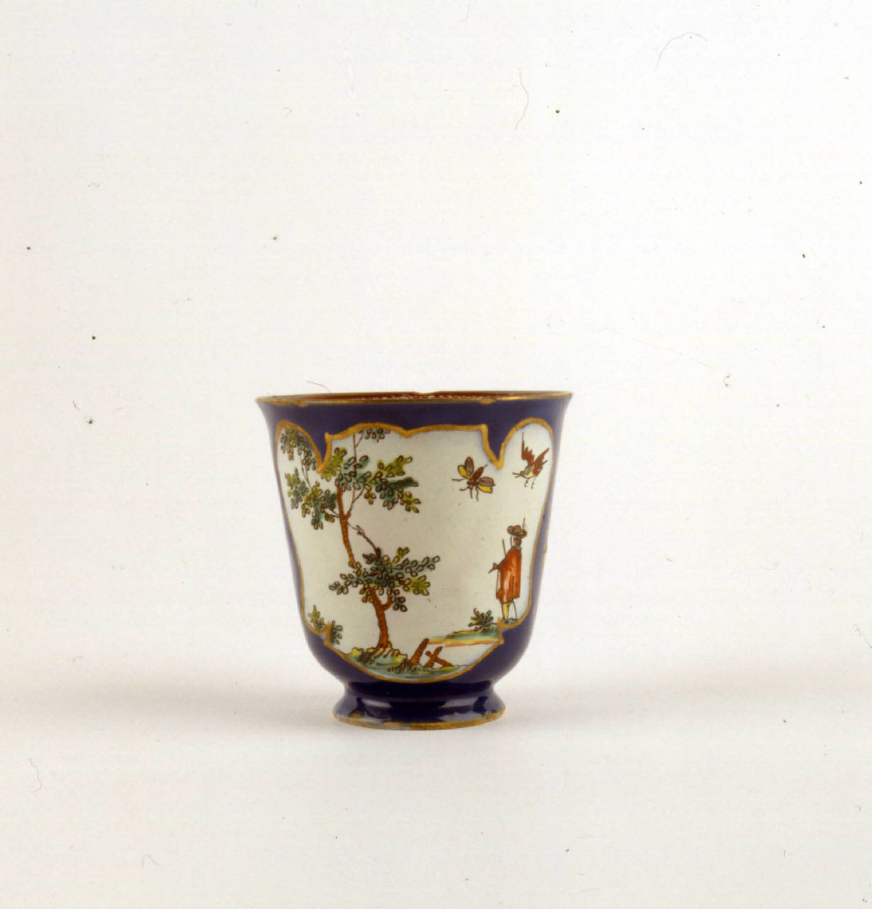 - NOTIZIE STORICO CRITICHE Tazzina a campana di una serie di nove, parte di un vasto assortimento "a paesini a smalto a comparto blu" (cfr. Inventario manifatture Clerici, A.S.M, Commercio, 199, 1788), detto nel mondo antiquariale "Milano blu", tra i capolavori della produzione della Manifattura di Felice Clerici (cfr. Ausenda, in Museo Arti, 2001).
