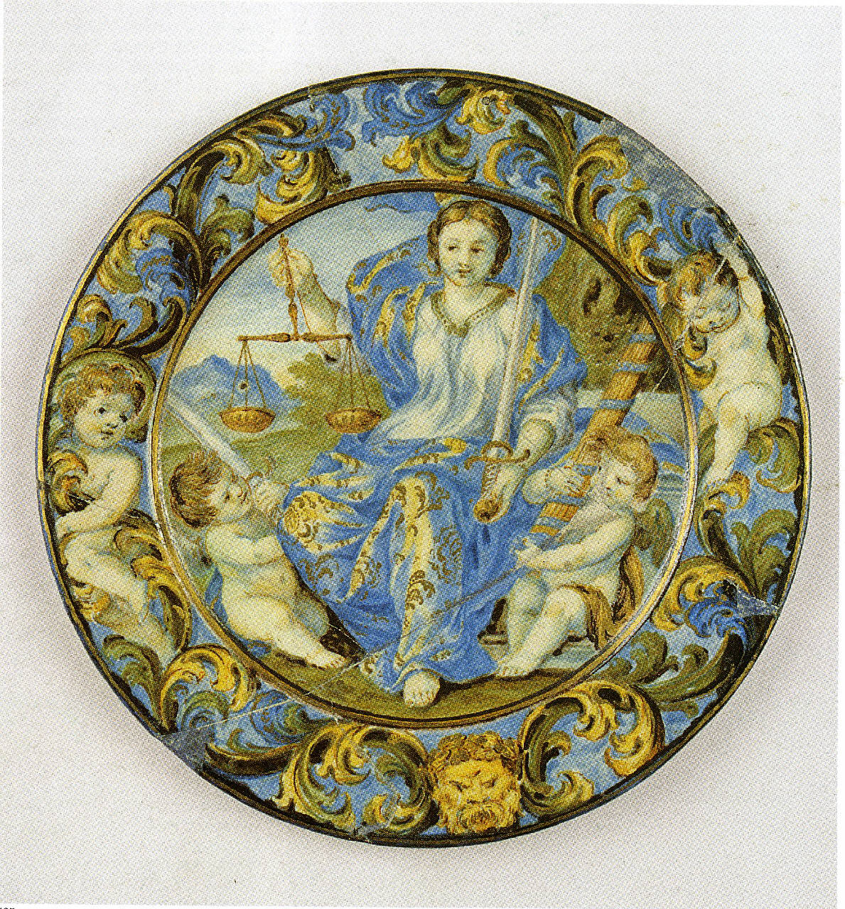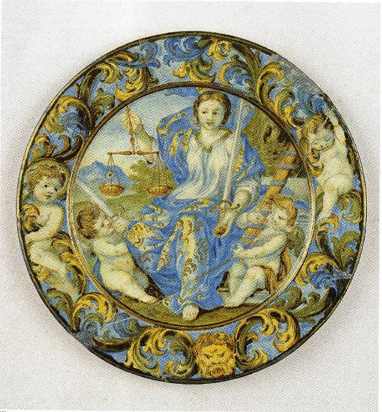 Piattino tondo con stratta tesa decorata a girali vegetali con due putti e un mascherone. Al centro è raffigurata la giustizia.