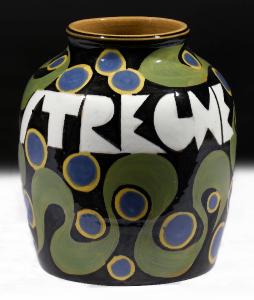 Vaso con corpo leggermente asimmetrico, larga base ribassata, corpo rigonfio, collo corto, bocca con bordo etroflesso. Su fondo nero decorazione geometrica raffigurante il volto di una strega.