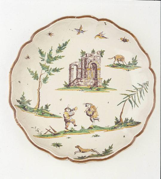 - NOTIZIE STORICO CRITICHE Il grande piatto in esame fa parte di un assortimento, denominato nell'inventario della manifattura Clerici del 1788 "a paesini e architetture", formato da pezzi di diversa cura esecutiva. Le figure rappresentate sono ispirate alle incisioni di Jacques Calllot (cfr. Ausenda, Museo Arti 2001).