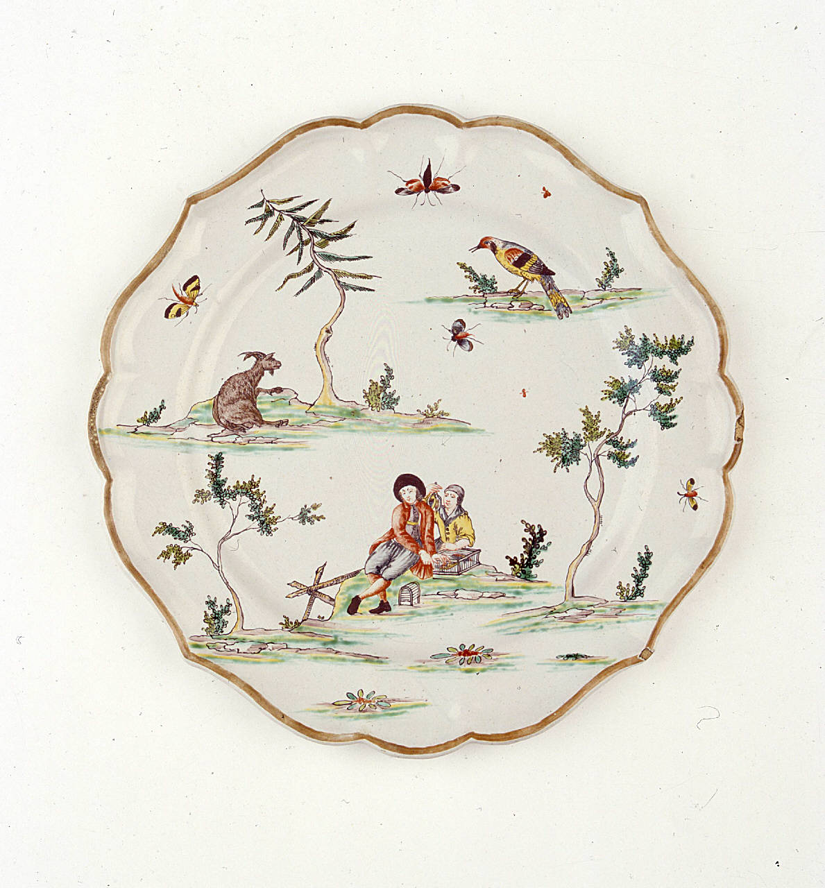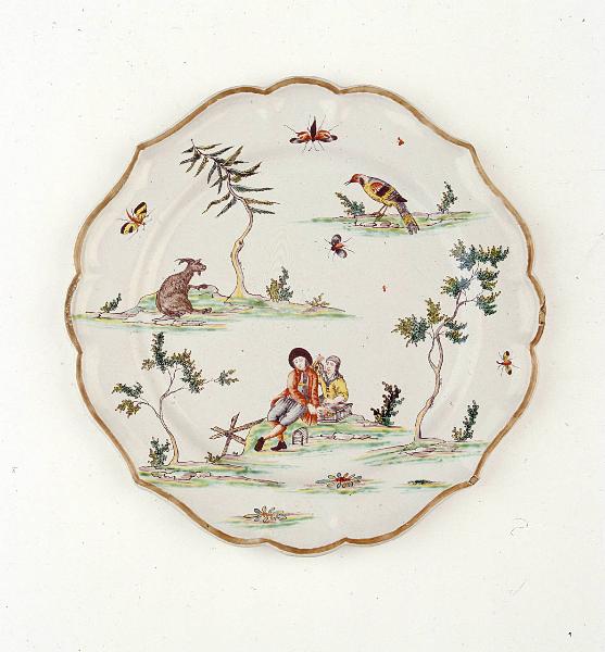 Piatto tondo dall'orlo mistilineo (quattro punte) ornato da motivi decorativi a isolotti con zolle, ove sono dipinti due uomini, alberi, un caprone, un uccello e insetti.