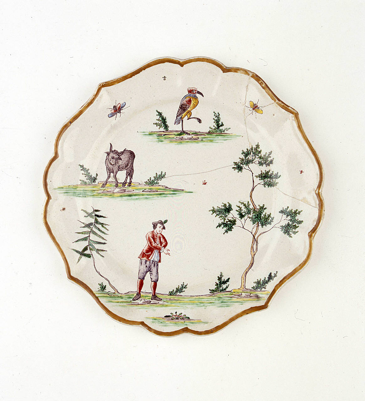 Piccolo piatto tondo (a quattro punte) ornato con motivo decorativo a zolle con figura maschile tra due alberi.