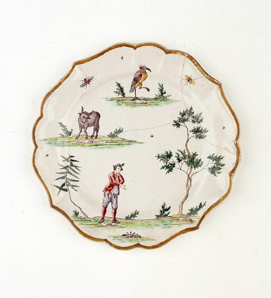 - NOTIZIE STORICO CRITICHE Il piatto in esame appartiene ad un assortimento composto da quaranta pezzi. Si tratta di uno di cinque piccoli piatti tondi a quattro punte (per gli altri si veda INV. 2300, 2299, 3488, 2305). Assegnato alla manifattura Felice e Giuseppe Maria Clerici. (cfr. Ausenda, In Museo Arti, 2001).