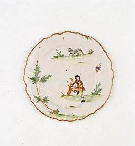 Piccolo piatto tondo (a otto punte) ornato con motivo decorativo a zolle con figura maschile nell'atto di spezzare un legno, leoncino, farfalla, insetti e arbusto.