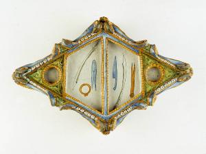 Calamaio a pianta romboidale su quattro piedini a zampa di leone e quattro, agli angoli, a volute sormontate da arpie. Due scomparti trepezoidali al centro, con dipinti oggetti come tagliacarte, compasso, penna, forbici, sigillo, e due circolari ai lati. Sui fianchi vani per i cassetti. Decorazioni a grottesche.