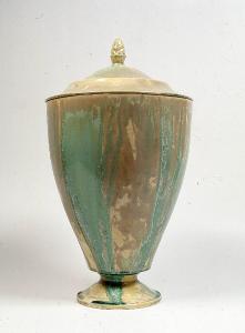 Vaso su piede svasato, corpo vasiforme rastremato nella parte inferiore, coperchio sagomato con pigna apicale. Decorazione con smalto beige chiaro con colature e cristallizzazioni color verde-turchese e verde scuro.
