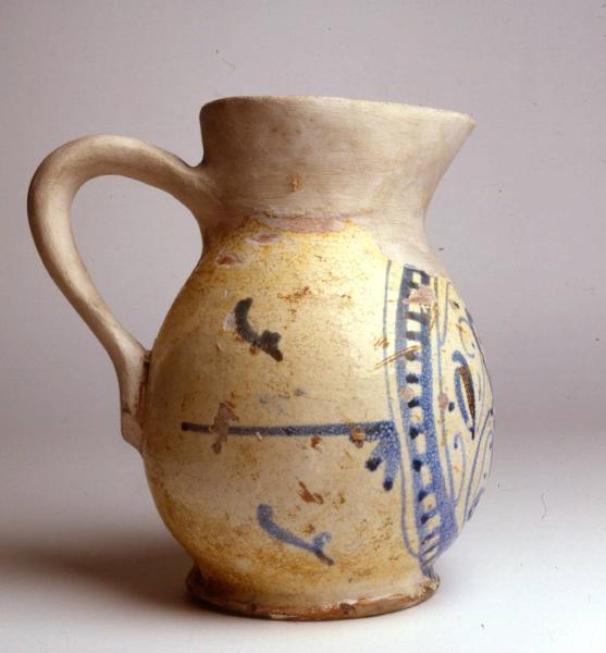 Corpo piriforme su basso piede a disco, bocca e ansa di ricostruzione. Modellato a tornio, pasta rosata, l'ingobbio riveste tutta la superficie esterna, l'invetriatura quella interna ed esterna, disegno realizzato in blu con petali campiti in verde e ocra. Decorazione del fronte composta da un fiore a tre petali entro cornice a scala con ciuffi a coda di rondine ai lati.