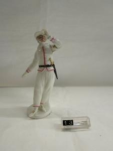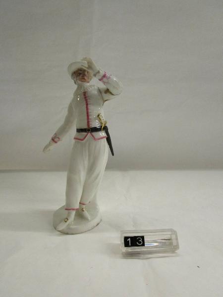 Figura maschile in smalto bianco, con tocchi di colore nero, rosa e oro, stante con largo cappello e collo a pizzo. Con il pezzo inv.14 fanno parte di una serie dedicata ai personaggi della Commedia dell'Arte. Braccio sinistro restaurato.