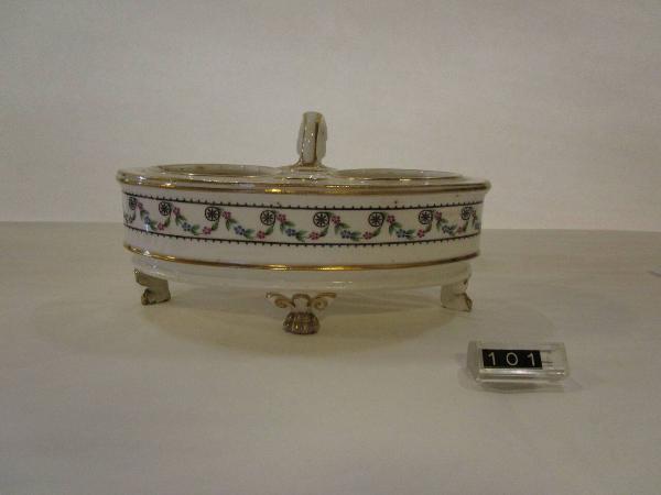 Porta ampolle per olio e aceto a forma ovale, poggiante su quattro zampe leonine, con manico ad arco desinente a chimera. Decorazioni lungo il bordo superiore di ghirlande di fiori e di tralci fioriti policromi. Filettature in oro agli orli rilevati, sul manico e sui piedini.