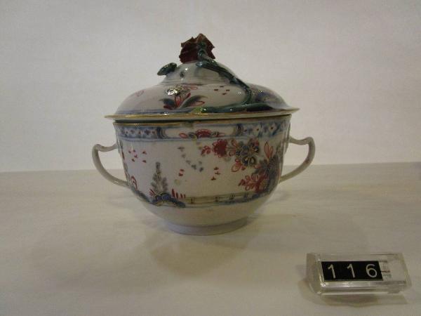 Tazza da brodo, a due anse desinenti a foglie, con coperchio ornato da pomolo a forma di garofano. Decorazione policroma di fiori e foglie di gusto nipponico in rosso e azzurro con lumeggiature in oro. Questa piccola zuppiera, come altre biansate, sono dette tazze da puerpera perchè destinate a contenere il brodo portato alle nuove madri, in origine nascono complete di un piatto che però in questo caso manca. Sul coperchio manca piccolo pezzo del gambo del garofano.