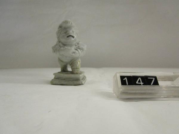Figura caricaturiale maschile (del genere di Jacque Callot) a smalto bianco, di nano su base quadrangolare a cornice.Camogio significa persona piccola