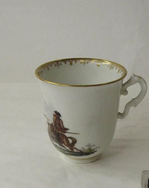Tazzina con manico a decorazione policroma con scene di combattimento tra un soldato a cavallo e un cavaliere, in costume orientale, con una pistola tra le mani. Sullo sfondo altri soldati. Orlo dorato con arabeschi.