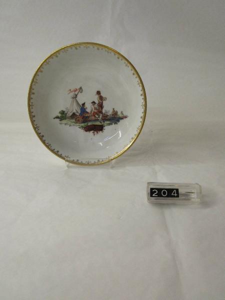 Piattino a decorazione policroma, decorato con la raffigurazione di due soldati, seduti sopra un tronco di albero presso una tenda, mentre giocano a carte. Vicino a loro un terzo soldato, sullo sfondo un cavaliere ed una tenda. Orlo dorato e arabescato.