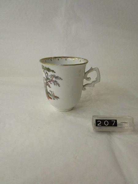Tazzina con manico a decorazione policroma con scene di combattimento tra un soldato a cavallo e un cavaliere, in costume orientale, con una pistola tra le mani. Sullo sfondo altri soldati. Orlo dorato con arabeschi.