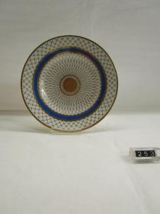 Piattino decorato a reticolo in oro con zona azzurra tra le due filettature dorate. Al centro del disco in oro. La tazza corrispondente è inv. 253.