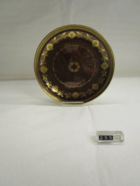 Piattino a fondo bruno, con orlo decorato di fregio circolare floreale. Sulla parte piana decorazione a ghirlanda di piccole foglie, al centro di essa si trova una corona di alloro in oro. Il sottotazza corrisponde alla tazza inv. 256.