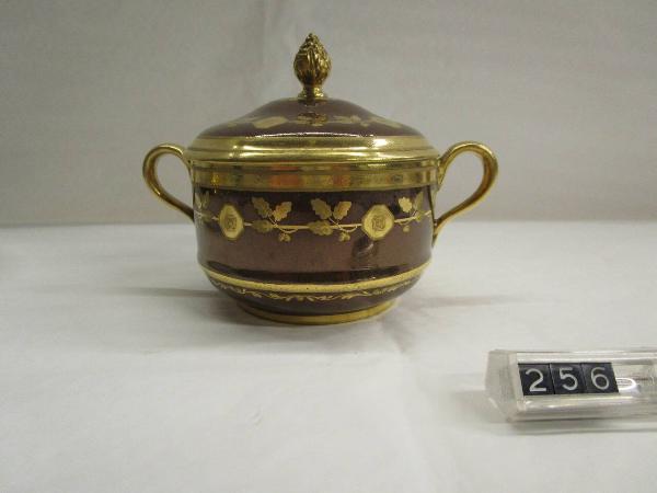 Tazza a due manici ad orecchio dorati, esterno a fondo bruno decorato di filettature in oro sull'orlo e di fregio circolare floreale. Nella parte inferiore due filettature in oro a piccolo fregio di foglie ricorrenti. Coperchio con pomolo a figura decorato similmente. Pomolo staccato conservato all'interno della tazza. Corrisponde al sottotazza inv. Porcellane 0255.