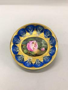 Piatto a quartieri azzurri ed ornati bianchi, orlo dorato ad archetti e largo medaglione, delineato in oro, ovale a decorazione policroma raffigurante un bambino mentre esce da una rosa, sullo sfondo paesaggio. Al rovescio la marca: scudo azzurro.