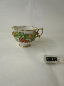 Tazza da caffè decorata con tralci, in rilievo e policromi, di fragole e ribes.