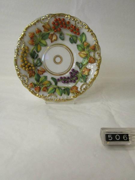 Piattino con decorazione, in rilievo e a colori, di fragole e ribes. Al centro filettature circolari in oro. Al rovescio la marca. Tazza corrispondente inv. 505.