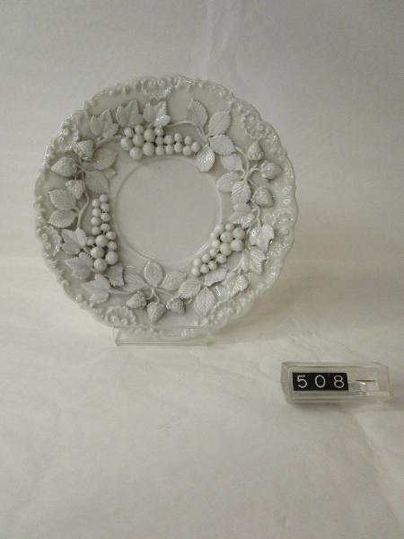 Piattino con decorazione, in rilievo, di fragole e ribes. Al centro filettature circolari in oro. Al rovescio la marca. Tazza corrispondente inv.507.