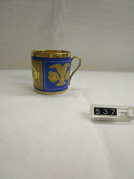 Tazza "Litron" cilindrica con manico ad orecchio. Fondo azzurro con cartella centrale rettangolare in oro finemente graffito in oro con figura di amorino seduto con una ghirlanda di fiori in mano entro cornice a squame. All'esterno due fregi in oro graffito su sfondo azzurro. Parete interna, orlo, manico e base in oro.
