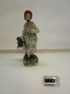 Figura di giovane donna stante vicino ad un tronco d'albero coperto di foglie e con una borraccia nella mano destra. Decorazione policroma con filettature d'oro. La base è rotonda con fiorellini a rilievo.